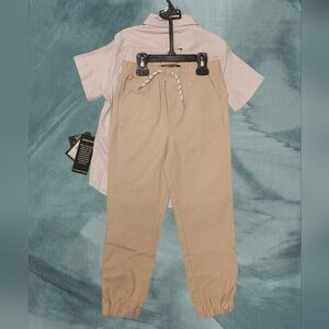 Stylish kids matching set by Kenneth Cole New York. Light lavender short-sleeve shirt with button details. Tan pants with elastic cuffs and waistband. Perfect for any occasion.