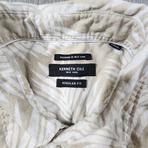 Elevate your style with this Kenneth Cole New York button-up shirt. The shirt features a beige palm print and is made of a linen and rayon blend fabric, making it perfect for all seasons. The shirt has a button-down collar and short sleeves, with a chest size that can be seen in the pictures. It also includes features such as easy care and pockets, making it a practical choice for any occasion, whether it be a casual day out or a wedding. The shirt has a regular fit and is available in size 2XL. The shirt is part of the Kenneth Cole New York product line and is perfect for those who love the beach, flowers, or classic styles.