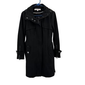 Gently Pre-owned. Professional Dry Clean Only. Perfect for women who like structure with a fashionable twist. Form-flattering due to the waist tie, which cinches the shape while maintaining a structured look. Deep black – classic, slimming, and polished. Wool blend gives it a warm, premium texture with durability for everyday wear. High Collar: Offers a sleek profile and warmth – adds a bold, minimalist statement. Zip and Snap Closure: Combines function and security with a layered, contemporary design. Zipper and button straps add visual interest and a slightly utilitarian, moto-inspired feel. Ideal for city commutes, professional settings, andstylish winter outings.