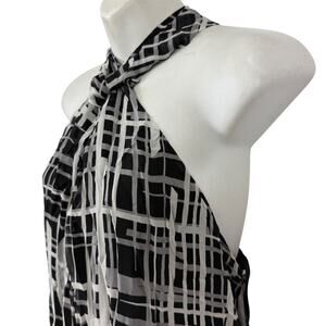 The Kenneth Cole New York Women's 100% Silk Sleeveless Print Black Top Blouse in size 14 is a stylish and versatile piece suitable for various occasions including travel, casual outings, and business meetings. Made from chiffon fabric with a geometric pattern, this blouse features a high neck with a button closure and halter strap accents. The sleeveless design and lined interior make it perfect for all seasons, while the classic black color and regular fit ensure a timeless and elegant look. Hand wash only to maintain the quality of this luxurious blouse from the renowned Kenneth Cole brand.