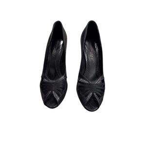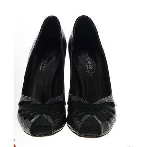 Keywords: Kenneth Cole, black pumps, leather heels, snake print, peep toe, women's shoes, elegant design, comfortable lining, stylish footwear, office wear, evening wear, pre-owned shoes.