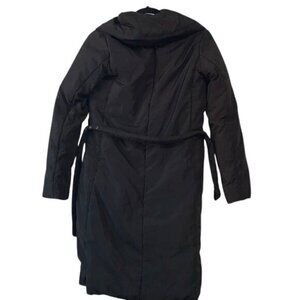 This Kenneth Cole New York coat offers warmth and style. It features a sleek design with a button closure, perfect for cold weather. Its down and feather filling ensures insulation while maintaining a lightweight feel. The hood adds extra protection against the elements.