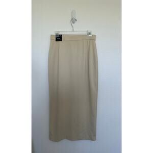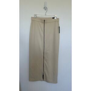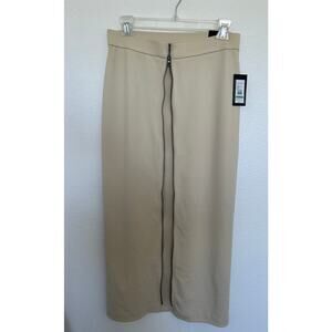 This skirt is versatile and a great basic piece. It comes in the shade almond milk, which it a lovely nude color. It is a classic midi-length pencil skirt with a twist. The back has a zipper closure that runs from hem to hem. It is perfect for a minimalist look. It has an elastic waist so it fits comfortably. There is one little pick mark on the back, please see photo. It has a little stretch. New with tags.