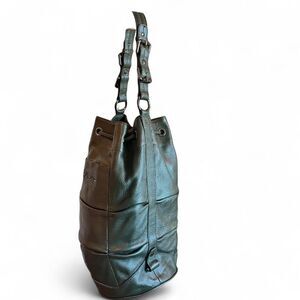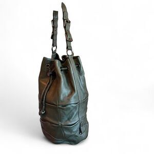 olive green leather, drawstring closure, silver hardware, chain strap, adjustable shoulder strap, monogram interior, spacious tote, structured round base, vintage leather, distressed details