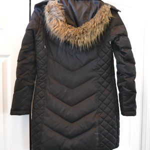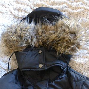 Down filled parka with removable faux fur trimmed hood. This jacket is warm enough to take on Midwest winters in style. All zippers and snaps are in perfect working condition. The hood is removable, if desired.
