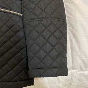 Black lightweight quilted 3/4 jacket (sits just below hips) with silver hardware. Great jacket for fall.