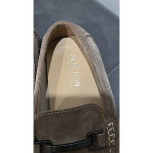 The product is a pair of beige Kenneth Cole Reaction loafers for men. They have a slip-on style and are made of leather. The shoes feature straps and are a size 10.5. Please review pics as these are pre-owned. Some wear spots. No box.