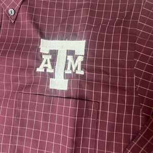 The product is a Kenneth Cole Reaction dress shirt in burgundy red, featuring a grid pattern. It is designed for men with a regular size and a neck size of 16.5 inches. This shirt is perfect for those who appreciate a stylish and sophisticated look, with a subtle nod to the Texas A&M theme. The long sleeves and classic design make it a versatile piece that can be worn for various occasions.