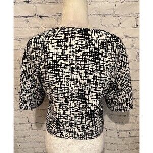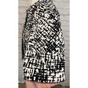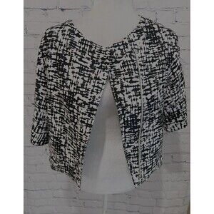 The Kenneth Cole Reaction Black and White Bell Sleeve Zip Front Jacket in size 6 petite is a stylish and versatile outerwear option for women. Made from polyester with a zip closure, this classic basic jacket features 3/4 sleeves and a black and white color scheme, making it a timeless piece that can be easily dressed up or down. Its petite size makes it a perfect fit for women looking for a sophisticated yet approachable jacket that can be worn year-round. There are a few light spots on the inside the jacket which can hardly be seen- see the pictures. This jacket measures 16 inches pit to pit and 16 inches long. Smoke free home.