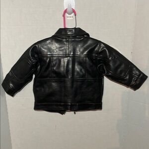 Chic black faux leather jacket. Perfect for a trendy look. Features sleek design.
