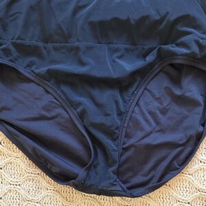 From the web: A sophisticated one-piece designed to graciously camouflage and contour with a tummy-toning liner and ruching in all the right places. Customize your look with the adjustable keyhole opening in front.