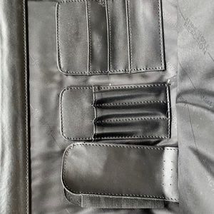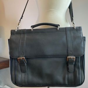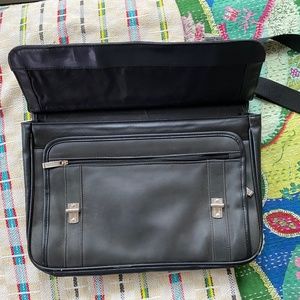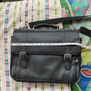 Black leather messenger bag, 16”x 6”x 10”. 2 separate full sized compartments, zippered side compartment and interior credit card, cell phone and pen holders. Adjustable shoulder strap, leather handle, and almost matte silver hardware. Could easily fit a laptop and tablet with room to spare. Used a handful of times, practically new.