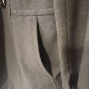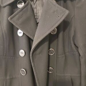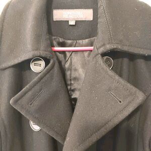 Kenneth Cole Reaction classic black wool blend double breasted peacoat size 10. 52% recycled wool blend. Structured tailored fit with waist seaming in the back for a flattering silhouette. Wide notched collar/lapel. Fully lined 100%polyester and functional side pockets. Armpit to Armpit 20in length 27in, sleeves 25in, shoulder 17in, waist 24in. Excellent pre-owned condition.