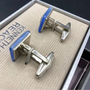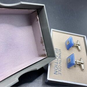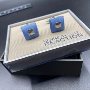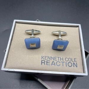 Kenneth Cole Reaction Blue & Silver Cuff Links. Beatiful cufflinks are in box and unworn. Box is rough and shows some wear and scratches, etc but has done a great job in protecting these nice cuff links. #11