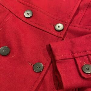 Elegant burgundy peacoat with double-breasted style. Features classic buttons and tailored fit. Perfect for chic layering.