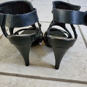 Leather upper with an open toe. The man-made outsole lends lasting traction and wear.