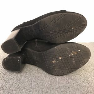 Pre-Owned, Fridah Cool Peep Toe Ankle Booties. In good condition overall. Scuffs on both boots from handling and a scrape on left heel. Verify pics. The boot shaft measures approximately 6 1/2" tall and has an opening of 11" heel height 3".