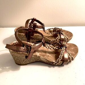 Braided Shiny Straps Make these sandals Pop. For a young girl, features a Cork sole, 2” heels, and an ankle strap with buckle.