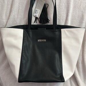 Large color block black and white tote with hanging tassel. The inside has one big zip pocket and two open pockets on the side.