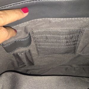 Professional PVC leather-look tote bag with multiple zippered compartments, credit card slots, and pockets. Detachable strap included; approx. 17 w x 12 H x 7 D and 42" strap. Style # KN1726 Only used once!