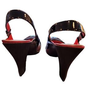 Hype Dream Black Slingback Heeled Shoe from Kenneth Cole Reaction. An elastic band runs over the shoe near the toes. Patent leather. Heel height 3.5 inches