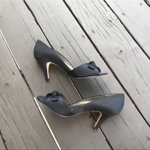 Black satiny peep toe high heels with a bow on top by Kenneth Cole Reaction. Good used condition. Minor visible flaws - not noticeable when wearing. 3.5” heels. Size 10M. Synthetic lining, leather sole.