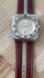 Description: Large square stainless case. Round gold-tone dial with date window. Stainless steel and luminous hands and markers. Large genuine leather strap. Just cleaned and serviced with a new battery installed. Works well!