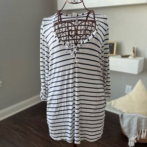 Women’s Kenneth Cole Reaction Long White and Navy Striped Blouse and my favorite feature is it has POCKETS on the sides. It does show some signs of wear but still in great condition! Size Large