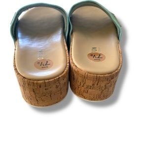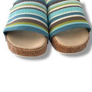 Cute and comfortable stretch upper from Kenneth Cole Reaction. 2in cork wedge heel. Teal, white, brown multi.