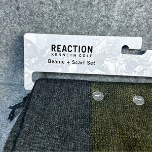 Elevate your winter look with this stylish 2-piece knit beanie and scarf set from Kenneth Cole/ Features an olive green/black/gray color scheme scarf with embossed logo & fringe trim. The olive green beanie has a logo patch on the front & fleece lining. One Size. New.