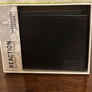 Elegant men’s black leather wallet by Kenneth Cole Reaction. Handcrafted for style and functionality. Has 8 credit card slots, ID slot and cash slot. Folds in half. Measures approximately 3 1/2 by 4 inches. New in box. All items from a smoke free home.
