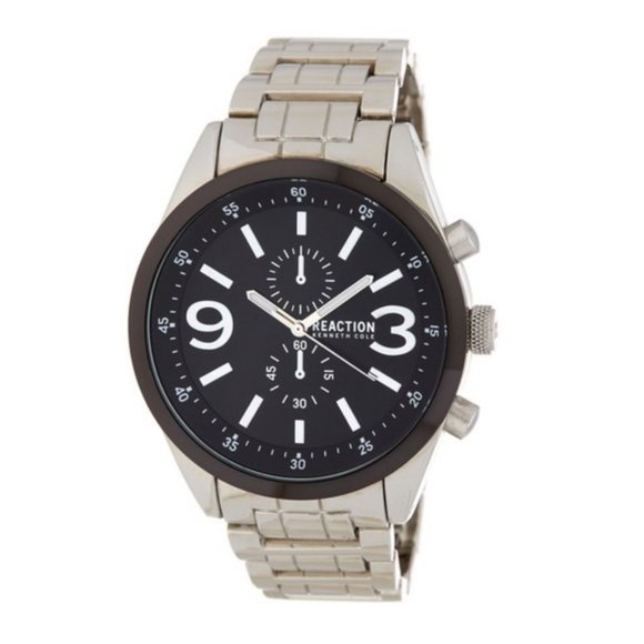 Kenneth Cole Reaction Men's Stainless Steel Watch, 47mm.New without a box.Still has stickers on the back and front of the watch. Tiny scratches on the black bezel and bracelet that are hardly visible. Details - Style #: RK50763007 - Gender: Men's - Case: Stainless steel - Dial Color: Black - Strap: Stainless steel - Clasp Type: Deployent - Movement: Japanese quartz - Crystal: Mineral - Case Diameter: 47mm - Water Resistant: 3 ATM/30 meters/100 feet