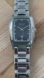Description: Blue textured rectangular dial with date window. Stainless steel and luminous hands and markers. Stainless steel bracelet with push-button clasp. Just cleaned and serviced with a new battery installed. Works well!