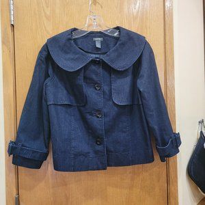 Kenneth Cole Reaction Navy Denim 3/4 Sleeve, Short, Button Front Jacket. Sailor/Peter Pan collar with strap and fabric covered buckle detail around the sleeves. This is an oversize 4, can easily fit size 6 or 8. 19" pit to pit, 20.5" shoulder to hem. Stretchy cotton blend. Excellent condition. Adorable spring-summer-fall jacket that goes well with pants or over a dress.Tabs and Fabric covered Buckles on Sleeves
