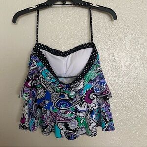 Kenneth Cole Reaction Halter Style, Ruffled with Paisley Design Swimsuit/Bathing-Suit top. Colors: purple, maroon, white, black and green