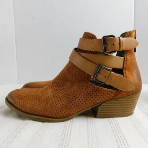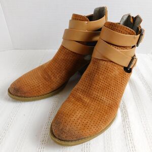 Kenneth Cole Reaction Booties in a Toffee Tan Genuine Sueded Leather. Buckle Detail, Back Zipper, Perforated Suede, Manufacturer Distressing on Toes and Backs.
