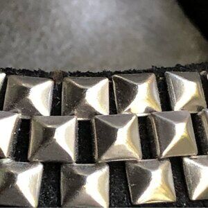 Kenneth Cole Reaction Black Suede Pumps / Heels with silver pyramid-shaped studs and a bronze / pewter accent strip. The style is called "Water Pyramid". Comfortable wider heel for ease in walking & standing. Leather upper, synthetic lining, man made soles, glossy heels. Soles are rubbery textured non-slip, and are super clean. Heel is 3" tall at center back. In very nice condition, pretty shoes. Ships promptly from non-smoking home. (#7109M)