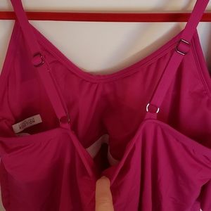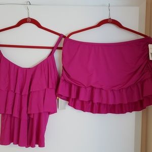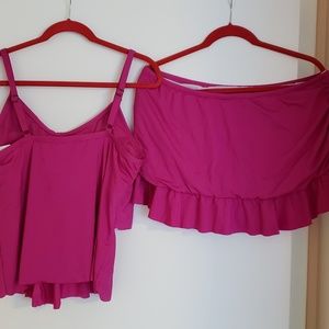 This beautiful pink two piece includes a tankini with shelf bra, adjustable straps and layered front and a skirt with build in bathing suit bottoms. Both pieces are size extra large.