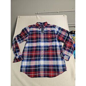 Introducing a stylish and versatile Kenneth Cole Reaction button-down shirt in size L. This shirt features a classic collared neckline and short sleeves, with a lightweight cotton blend material that makes it suitable for all seasons. It comes in a striking multicolor pattern with button accents and a button-down closure.