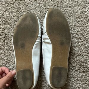 White pleather ballet flats with toe and heel reinforcement, bow accent, and strap. A little worn but no real damages. Tabi-resonant. Ruched detail on front of shoe