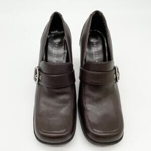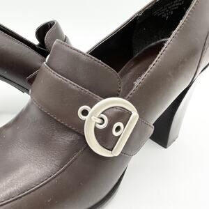 Kenneth Cole Reaction pumps combine professional polish with retro-inspired minimalism. The brown leather upper and silver-tone buckle detail elevate tailored trousers or pencil skirts for office meetings, while the block heel offers comfort for after-work events. Pair with cropped denim and a blouse for urban weekend brunches—these pumps transition effortlessly from desk to dinner, adding timeless sophistication to any ensemble.