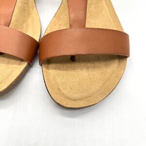 Kenneth Cole Reaction women's Great Gal toffee brown faux vegan leather low wedge t-strap sandals.