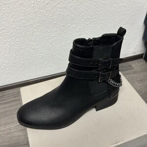 Step out in style with these sleek black ankle boots. Featuring a chic chain detail, these boots are perfect for any occasion. Pair them with your favorite outfit for a bold look.