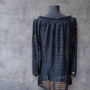 Kenneth Cole Reaction black, off-the-shoulder, sheer, long-sleeved blouse.