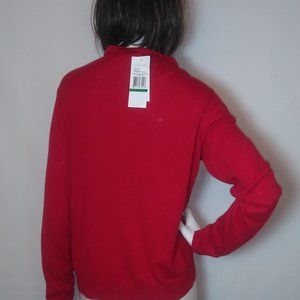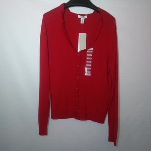 Kenneth Cole Reaction ruffled cardigan. NWT. Size L. Color: Red. Material 53% Cotton, 40% Rayon, 7% Nylon. Features ruffles around the neckline and down the center. Approximate measurements aid flat: armpit to armpit 20 ¼’’, length from shoulder to hem 24’’. Colors may slightly vary due to photographic lighting.