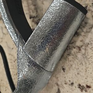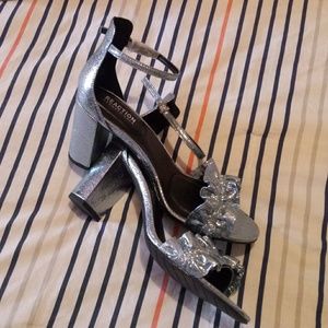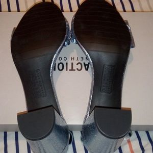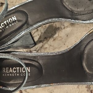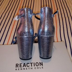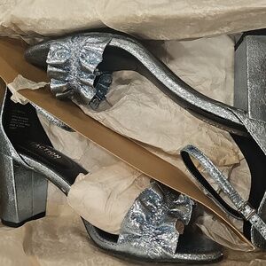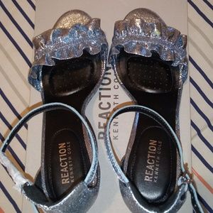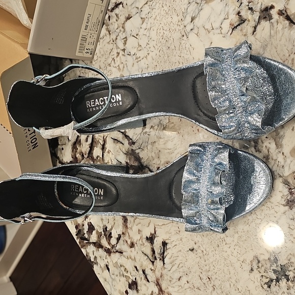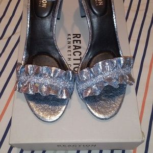 Kenneth Cole Reaction Rise Ruffle Heels. Color is storm. They are a silvery blue. They are NWOT but not perfect. See pictures. Size 9.5 Medium