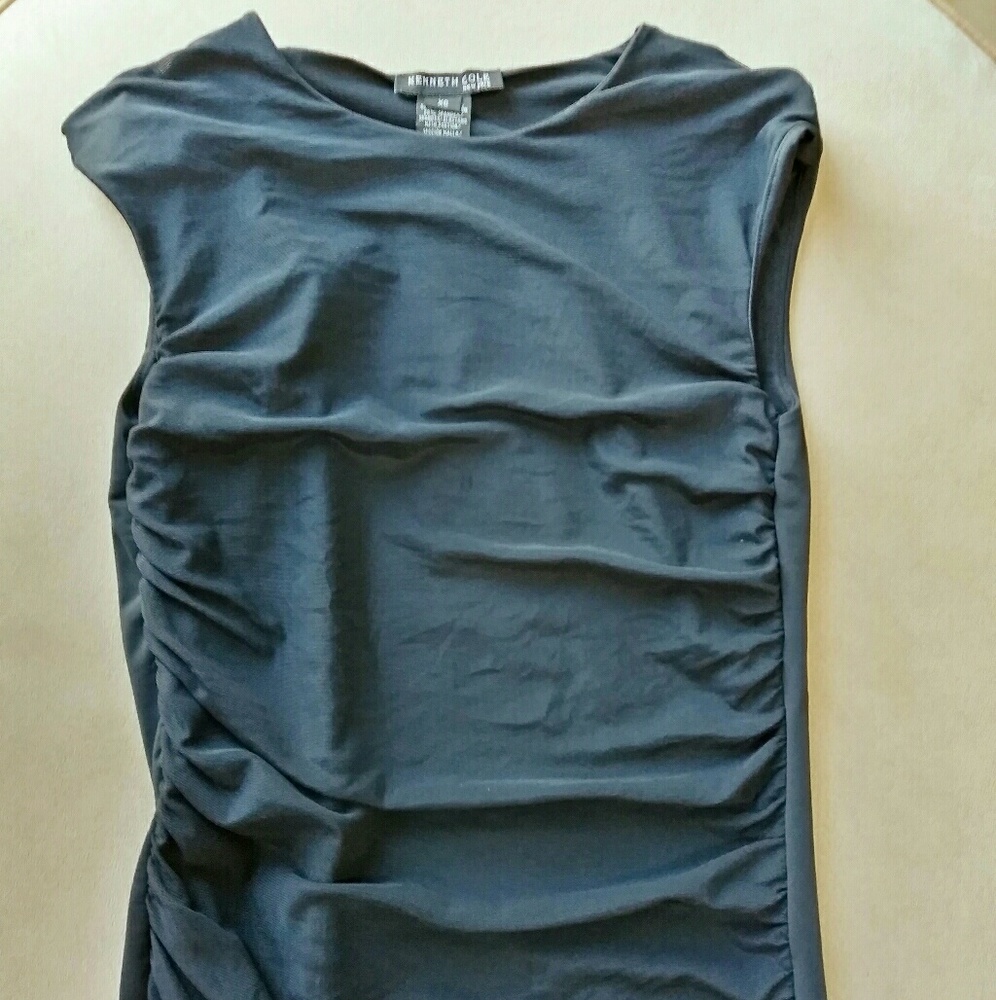 Navy blue, slim fitting shell by Kenneth Cole New York. Ruched mesh overlay panel covering front of shirt. Falls at waist. Nice used condition.