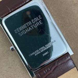 Kenneth Cole Signature Watch Silver Tone Brown Leather Band Analog Quartz Watch 20881. Condition is Hardly Pre-owned Nice Embossed Brown Leather Strap 10 inched in length. Silver case is 1.75x1.1.18 Inches. Brown Wood Grain Enamel Dial, Roman Numerals Silver hands and markers, Scratch Free Mineral Crystal stainless steel back New Battery