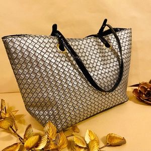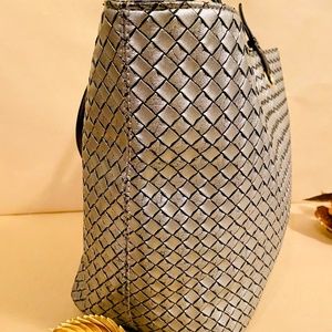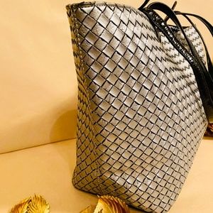 Stylish Kenneth Cole tote bag. Features a silver woven pattern. Black handles with gold accents. Perfect for everyday use.