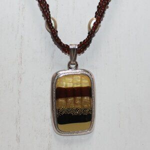 Awesome Vintage KC Sterling Silver & Enamel Pendant with Beaded Amber Dual Strand Necklace, Pre-owned in like-new condition